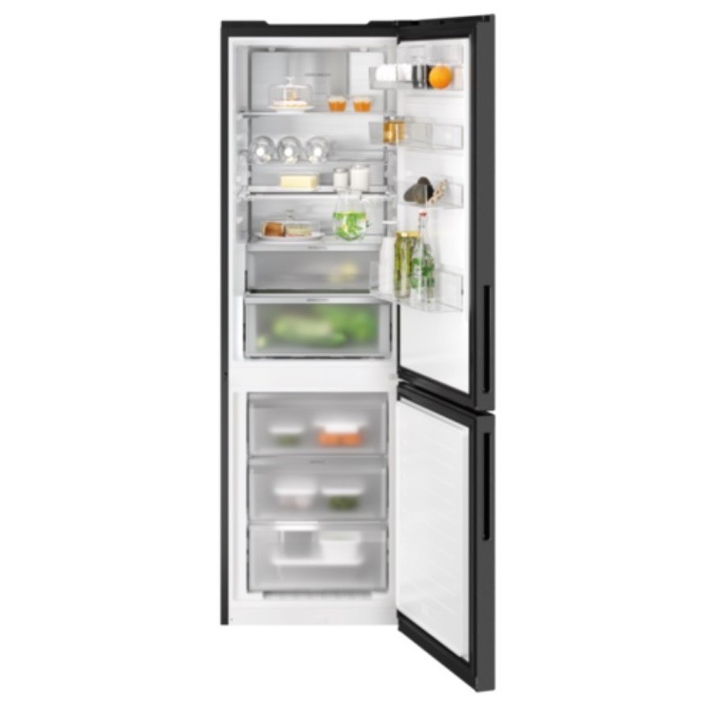 Kombinirani hladnjak 800 Cooling 360° sa ledenicom dolje, , Hladnjak 225 L (203 + 22 Fresh Zona), ledenica 103 L, , Energetska klasa E(20) C, Buka 34 dB E(20) B, , Elektronski LED termometar i 2 termostata u unutrašnjosti, , TwinTech® - FrostFree - odvojeno hlađenje hladnjaka (klasično hlađenje) i ledenice NO FROST (hlađenje zrakom), , Inverter Kompresor, Održavanje u slučaju nestanka struje: Zamrzivač h / Hladnjak E(20) 10h, , MultiFlow 360 Metal Cooling - distribucija zraka po policama sa kontrolom vlage i filterom mirisa, , Wi Fi Povezivanje – My Electrolux App: Quick Chill funkcija, Quick Freeze funkcija, Eco mode (postavljanje), Rest Mode, UI Svijetlo (AUTO push-button), Brzo Hlađenje Pića timer & alarm, Porast temperature. Ledenica alarm, , GreeneZonePlus ladica za voće & povrće sa automatskom kontrolom vlage, Extra Chill ladica, Crna INOX vrata sa premazom protiv otisaka prstiju - desna ili lijeva, , Elektronske kontrole na dodir s LCD pokazivačem na vratima; Svijetlo: LED gore i sa strane, , FUNKCIJE ELEKTRONIKE: Brzo zamrzavanje sa Auto Return 10Kg/24h, Intenzivno hlađenje novih namirnica, Holiday Funkcija, Audio Indikator otvorenih vrata (samo hladnjak), , Vrata: CustomFlex - 1 mala sa poklopcem + 4 male + 1 velika za boce; 1x 6 jaja, , Hladnjak; 1 polica pune veličine + 1 FlexiShelve + 1 ravna za boce; 1 ladica Voće & Povrče Auto kontrola vlage + 1 ExtraChill ladica, , FLEKSIBILNA ledenica sa 2 velike ladice + 1 mala / 2 police; Zamrzavanje 10Kg/24h, , Dimenzije u cm: 187 V x 59.5 Š x 66,4 D